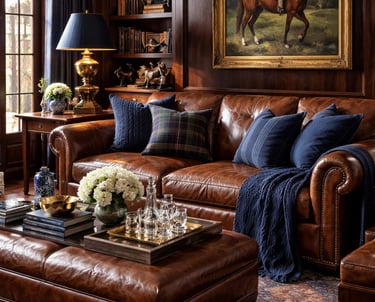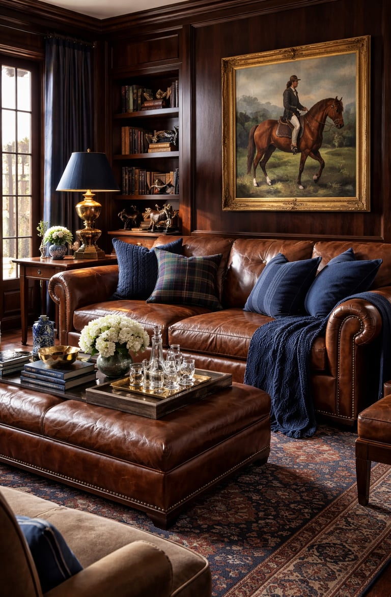The Ralph Lauren–inspired timeless living room embodies classic American interior design, luxury home decor, and elegant equestrian style. This curated space blends rich leather furniture, tailored textiles, warm wood tones, and refined details to create a living room that feels both sophisticated and livable. Inspired by Ralph Lauren’s iconic aesthetic, this decor style focuses on timeless design, heritage craftsmanship, and elevated comfort—perfect for anyone who loves traditional home decor with a modern luxury edge.